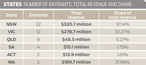 Victorian companies placed a close second, both in terms of entrants and revenue. Victorian revenue was $278.7 million, versus $320.7 million from NSW. Big Melbourne contributors were publicly listed RXP Services (No.20), which is headquartered in Melbourne and turned over $127.1 million, as well as $38.2 million Revolution IT (No.44) and former No.1 NGage Technology Group (No.10), which turned over $27.7 million.