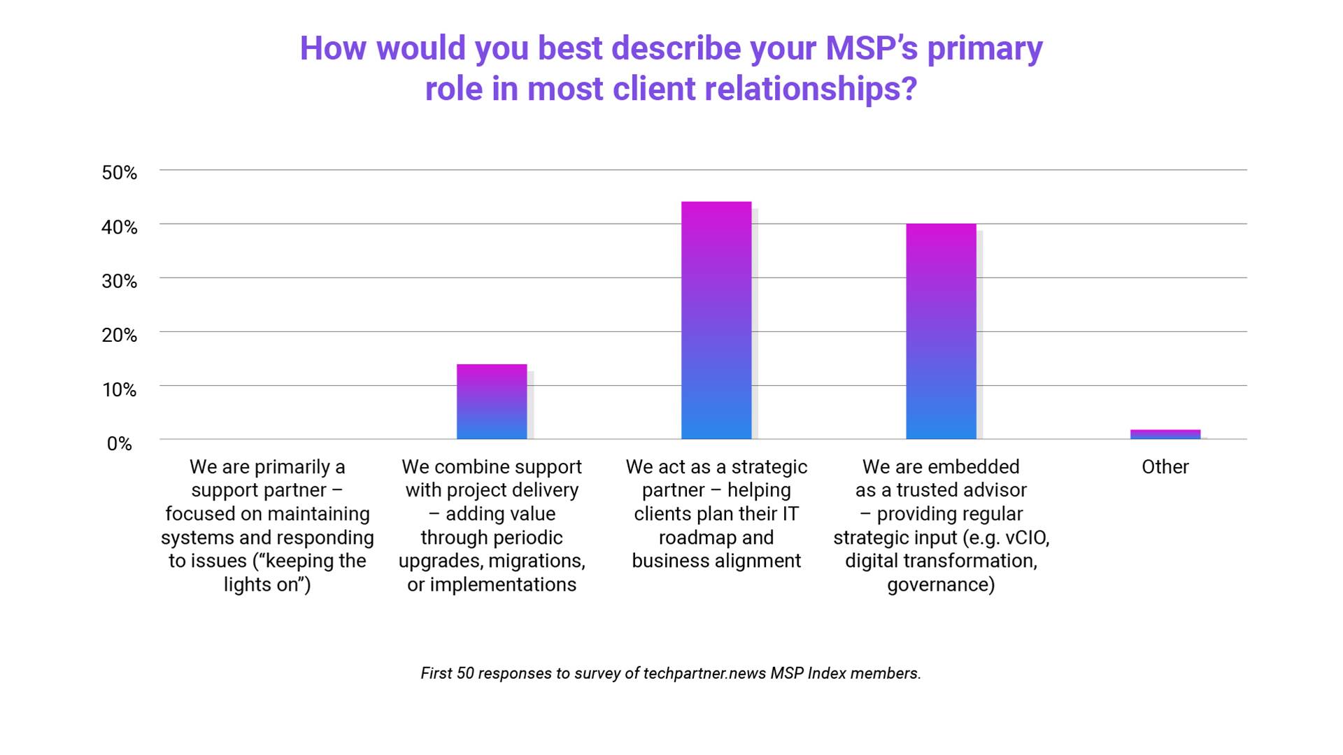 When asked to self-assess their primary role in most client relationships, 44 percent of MSPs described themselves as a strategic partner helping clients plan their IT roadmap and business alignment. This was only slightly ahead of the 40 percent who believed they were embedded as a trusted advisor providing regular strategic input.