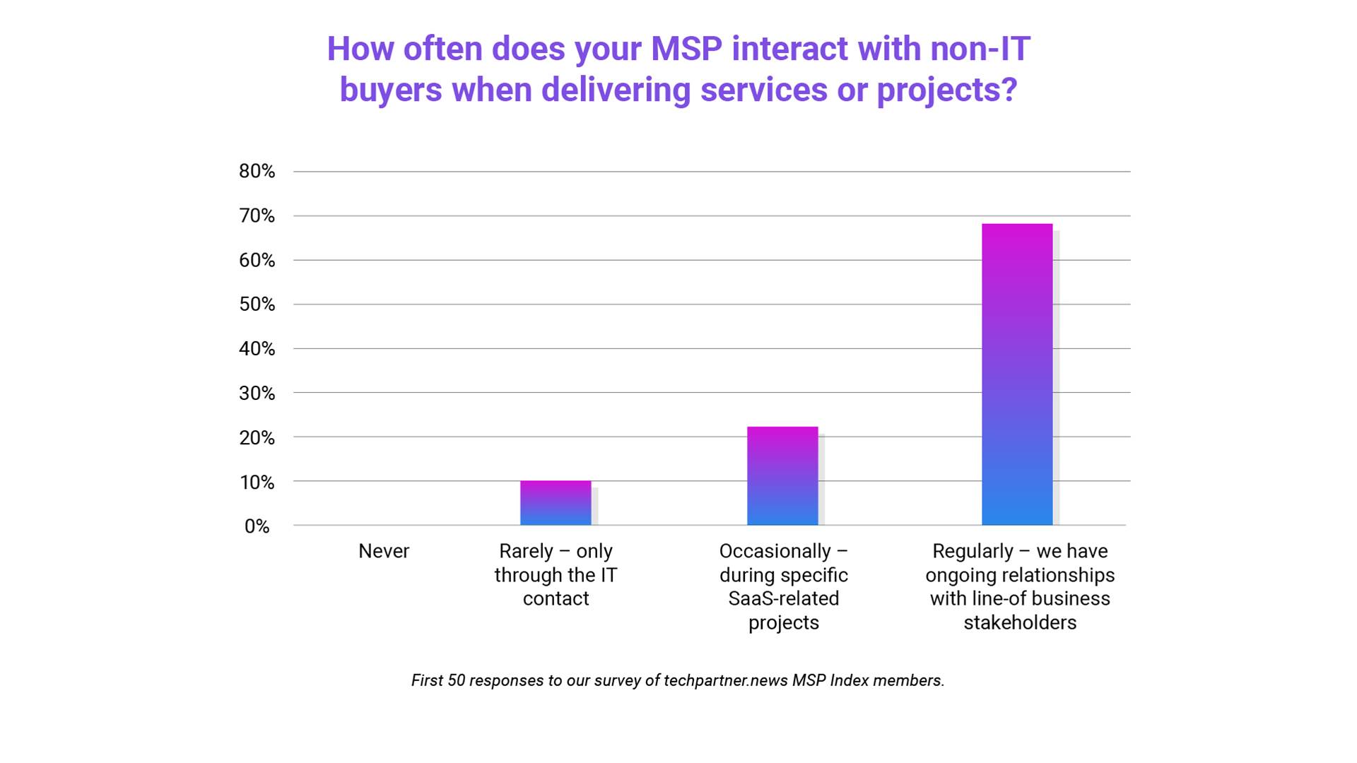 This trend was further reflected through the expansion of MSPs’ conversations beyond just the realm of technical buyers. Over two thirds of respondents indicated they had ongoing relationships with line-of-business stakeholders when delivering projects, including heads of sales, marketing, HR, finance, and other executives. This compared to just ten percent who engaged only through their IT contact.