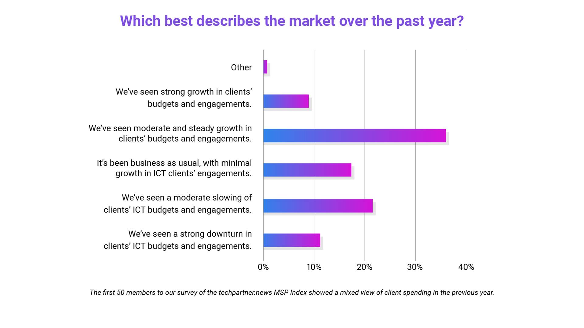Those bets appear to have been well placed, for the past year at least, with 46 percent of respondents to a survey of our MSP Index members reporting moderate through to strong growth. That fortune has not been spread equally however, with 12 percent witnessing a strong downturn in clients ICT budgets and engagements.