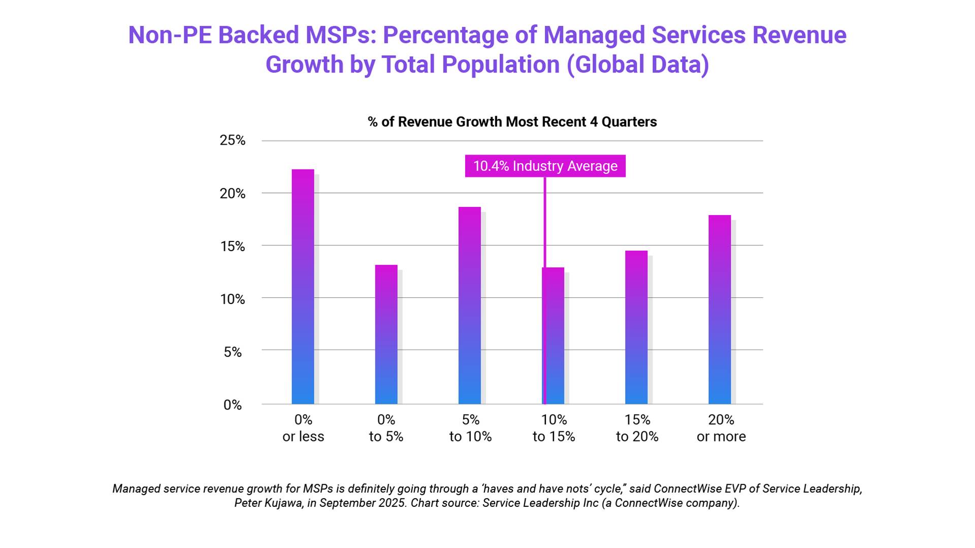 As for the scale of growth, global data from Service Leadership Inc (a ConnectWise company) shows that organic managed services revenue is running at 10.4 percent, which is within the historical 10-14 percent range, with 32.6 percent of partners growing at over 15 percent and 18 percent growing over 20 percent. Of course, this still leaves 54.5 per cent growing under 10 percent, with 22.4 percent growing at 0.0 percent or less.
