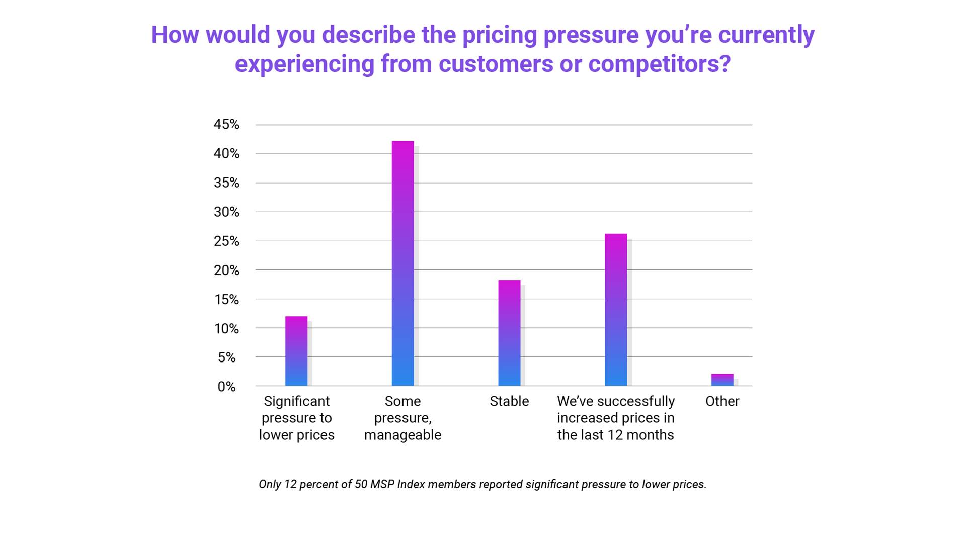 This is not yet reflected in our MSP Index data, however. While 42 percent of MSPs reported some pricing pressure of late, another 18 percent said prices had been stable, while 26 percent reported that they had successfully raised prices. Only 12 percent reported significant pressure to lower prices.