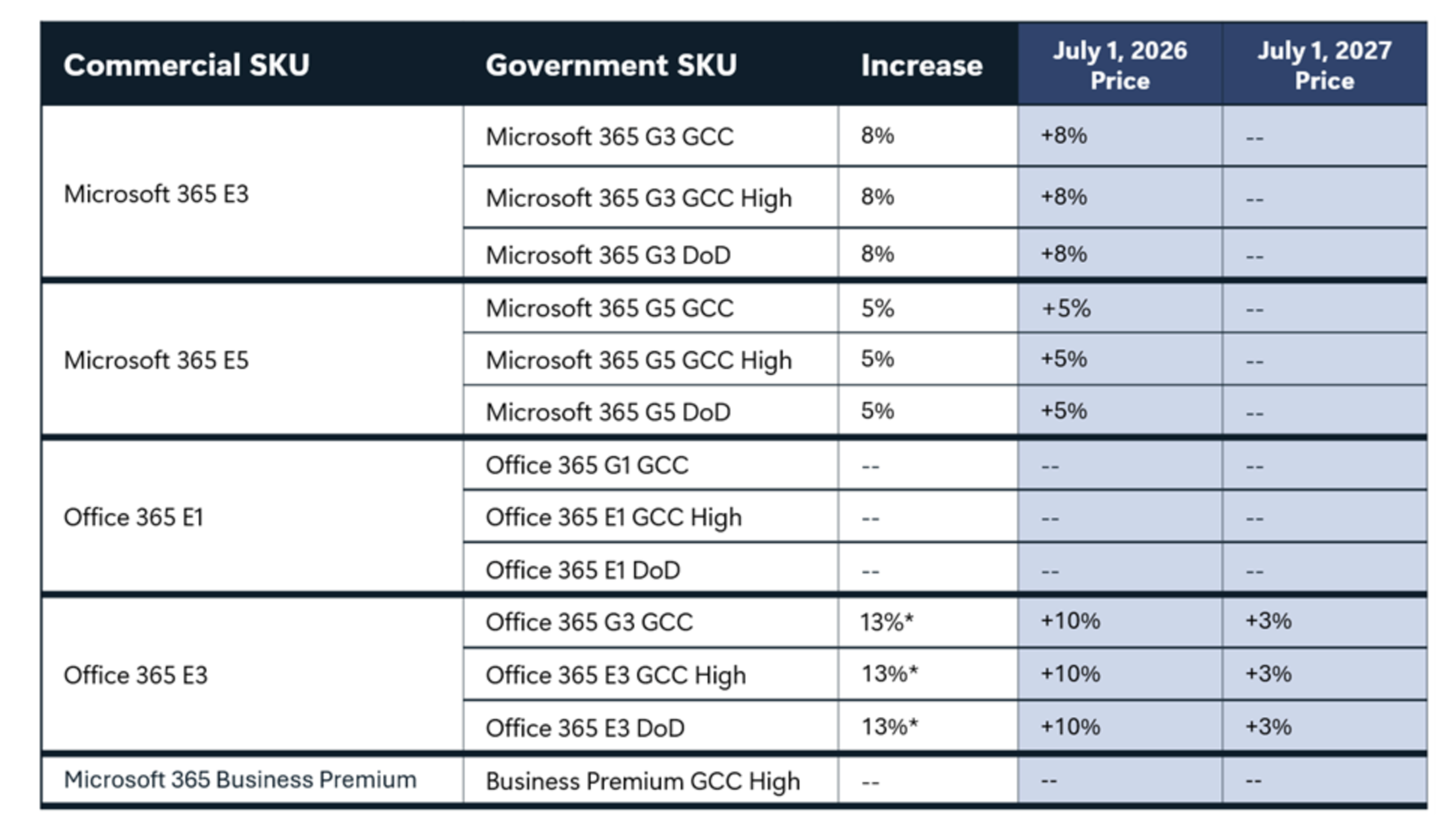 On July 1, 2026, the company will update its list pricing for Microsoft 365 G3 (GCC, GCC-H, DoD), Microsoft 365 G5 (GCC, GCC-H, DoD), Office 365 G3 (GCC), and Office 365 E3 (GCC-H, DoD).