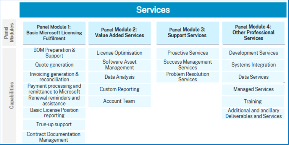 These comprise of Basic Microsoft Licencing Fulfilment (BMLF); Value Added Services (VAS); Support Services (SS); and Other Professional Services (OPS).