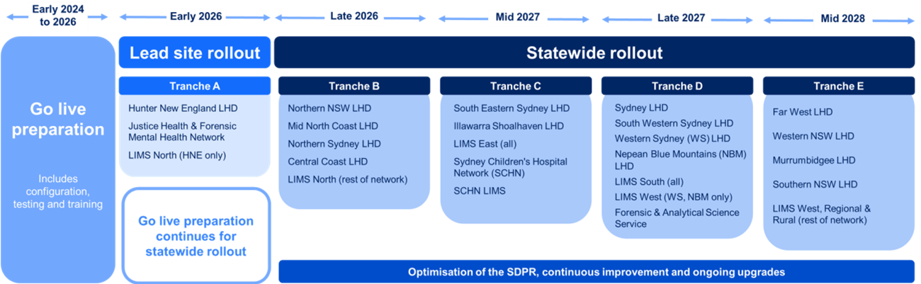 The roll out will occur in five stages, with the first go-live including Hunter New England Local Health District, Justice Health and Forensic Mental Health Network and NSW Health Pathology (Hunter New England sites) in March 2026.